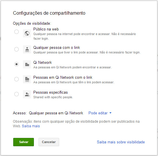 Pode-se atribuir qualquer nível de permissão à qualquer modo de visibilidade. Ou seja: É possível elaborar um documento que todos podem ver, mas só o seu time pode editar, por exemplo. Ou ainda uma apresentação onde determinadas pessoas podem apenas deixar comentários, enquanto outras podem fazer modificações livremente e ainda responder os comentários.