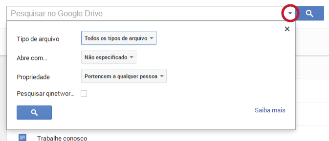 Depois de aberto, o Drive apresenta uma página inicial e no topo, a caixa de pesquisa. Para fazer qualquer busca otimizada, vai ser preciso, antes de digitar um termo relativo ao conteúdo que se pretende encontrar, clicar na setinha do menu drop down para escolher uma das opções que ele apresenta. São elas: