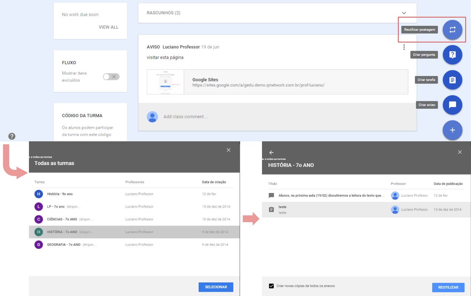 Professores agora podem compartilhar tarefas, anúncios ou perguntas de uma sala para outra, desde que tenha com permissão para colaborar. Uma vez que escolherem o que será compartilhado, o conteúdo poderá ser editado antes da postagem ou tarefa.