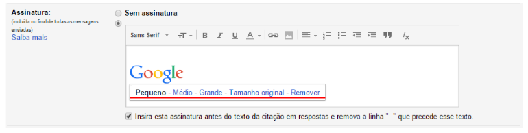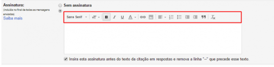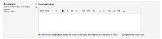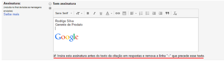 4. Você ainda pode selecionar se deseja inserir esta assinatura antes do texto da citação e remover a linha “–” que precede o texto. Desta forma, sua assinatura aparecerá acima da mensagem sem a linha que a separa de sua mensagem.