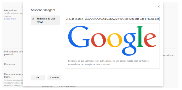 Insira a URL da imagem do ícone que deseja colocar. Para isso, abra a página web onde se encontra a imagem, clique com o botão direito sobre ela e em “copiar URL da imagem”. Cole no campo da caixa de inserção de imagem de assinatura do Gmail e clique em “OK”.