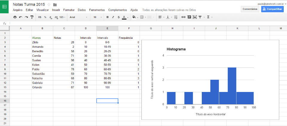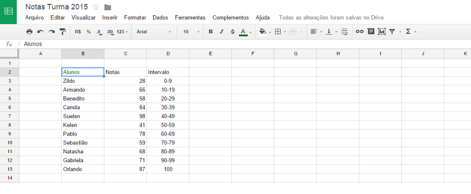 Já na planilha, faça uma coluna com todas as notas dos alunos. Em seguida, crie uma coluna com os intervalos possíveis de notas — quem tirou de 0 a 9, de 10 a 19 e assim por diante, até chegar ao 100, nota máxima possível. Esses intervalos devem ser representados cada um em uma linha diferente.