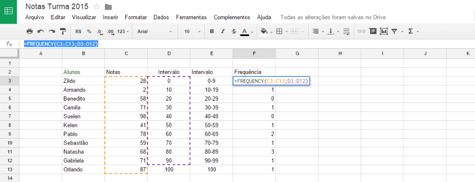 Agora será preciso criar uma coluna para a frequência das notas. Nesse momento, digite “=frequency” para criar a fórmula de frequência e dê enter. Após digitar tudo, selecione primeiro as notas dos alunos. Depois digite “;” e selecione os intervalos. É importante não selecionar a nota final — 100! —, caso contrário, a fórmula não funcionará. Assim, a planilha gerará, automaticamente, os números que representam as ocorrências das notas, baseando-se no que foi previamente lançado.