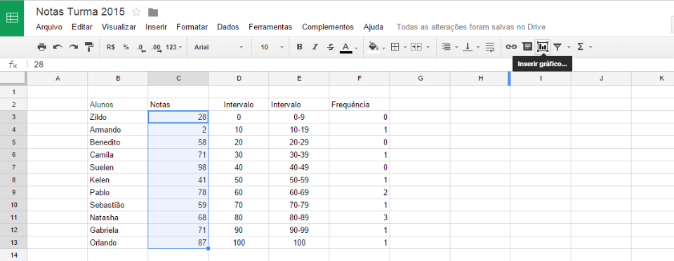 Uma vez com a frequência pronta, o gráfico já pode ser gerado. Para isso, selecione a coluna das notas, pegando todos os dados gerados. No menu Inserir clique em “Gráfico”.