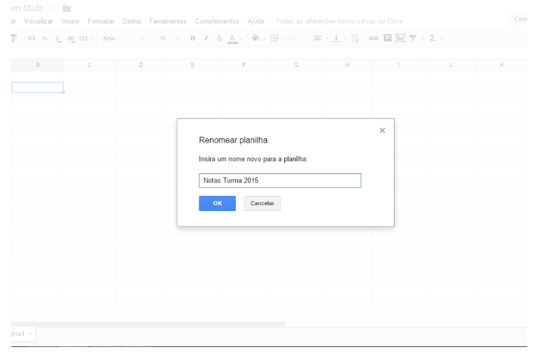 Antes de mais nada, acesse, por meio de sua conta Google, o Drive. Aí opte pela criação de uma Planilha Google. Vai se abrir um novo arquivo com uma planilha em branco. Renomeie-o de acordo com o tópico abordado — como, por exemplo, “Notas Turma A 2015”.